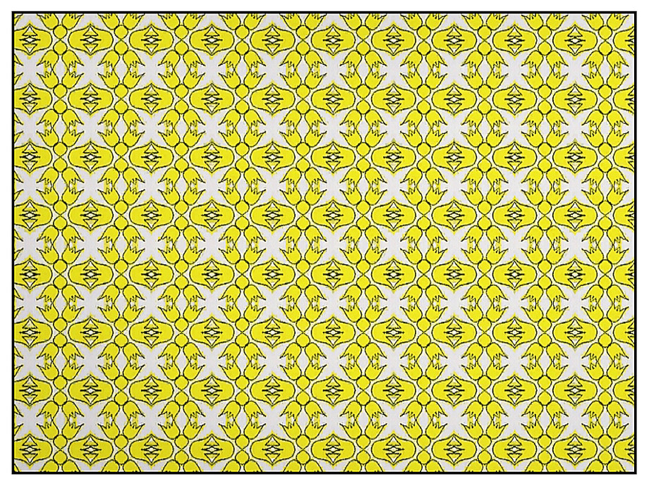 Fabric pattern - groups of six tulip paisley elements in a regular repeat design in bold yellow.