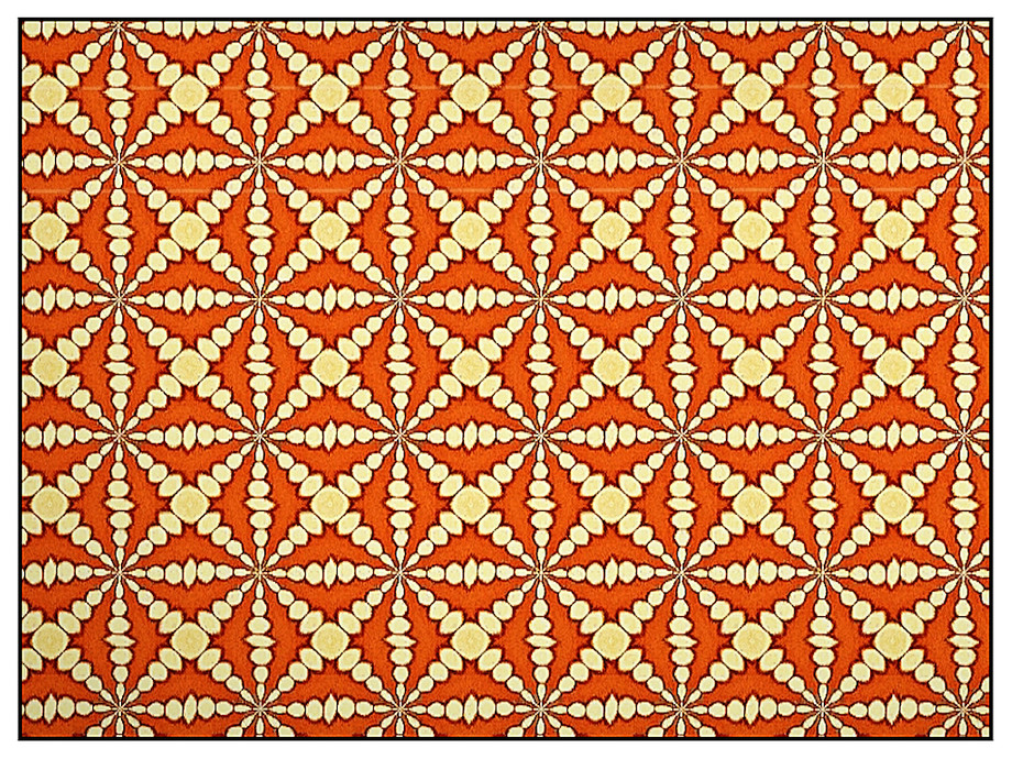 Fabric pattern: 8-petal daisies extended to form a squared tile design in red ochre and yellow