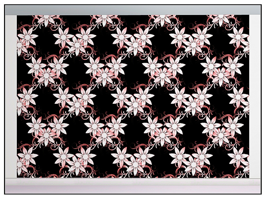 Fabric pattern: white clematis flowers tinged pink on black