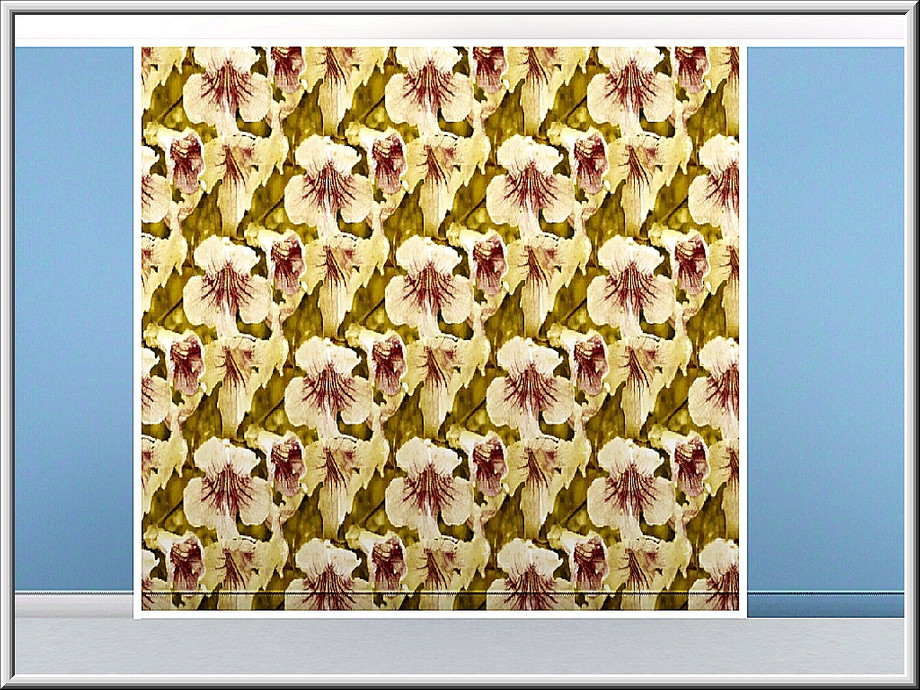 Fabric pattern: pale yellow trumpet blooms with purple veins.