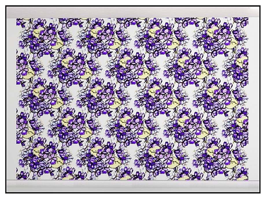 Fabric pattern - purple violsets on white, with yellow accents.