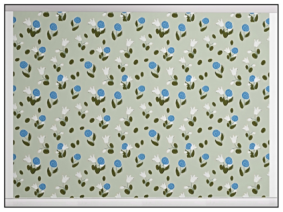 Fabric pattern: small flower shapes in blue and white on pale sage green