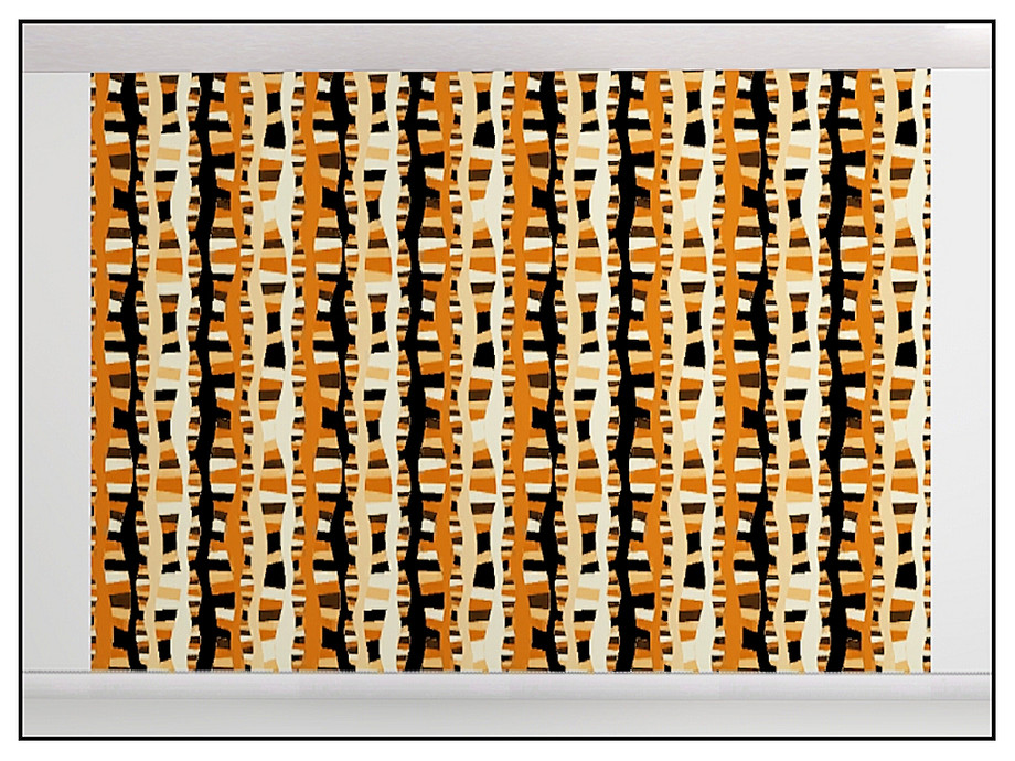 Geometric pattern: distorted ladder shapes in earth tones on black.