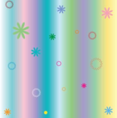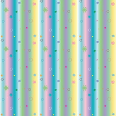 A vertical rainbow of pastel shades, overlaid with 8pointed starry shapes and circles, in contrasting colours.