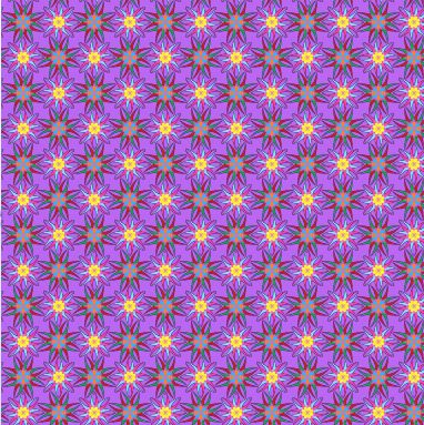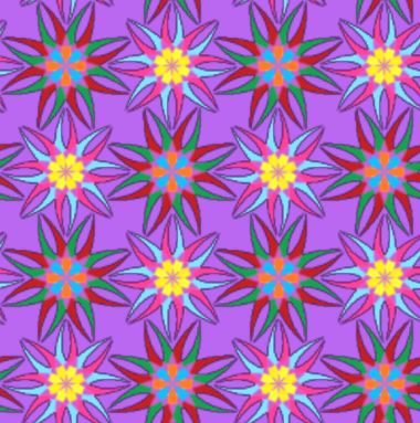 A bright, allover repeat pattern of star shaped flowers on a purple backing. The yellow centred ones reminded me of Granny Bonnets [Columbines/aquelegia].