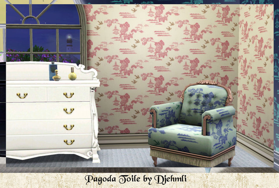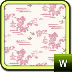 A toile pattern featuring pagodas and seagulls. Three color-able palettes