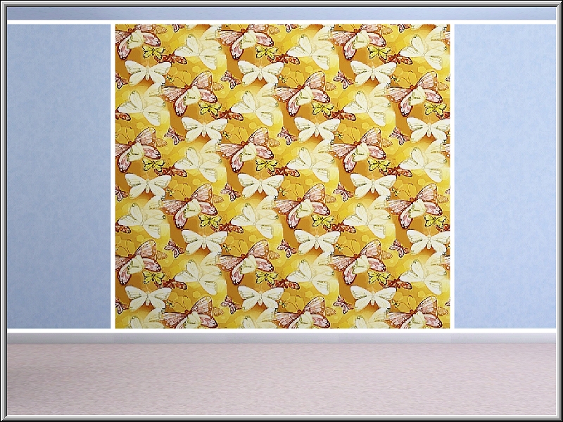 Themed pattern: flights of red, yellow and white butterflies on amber.