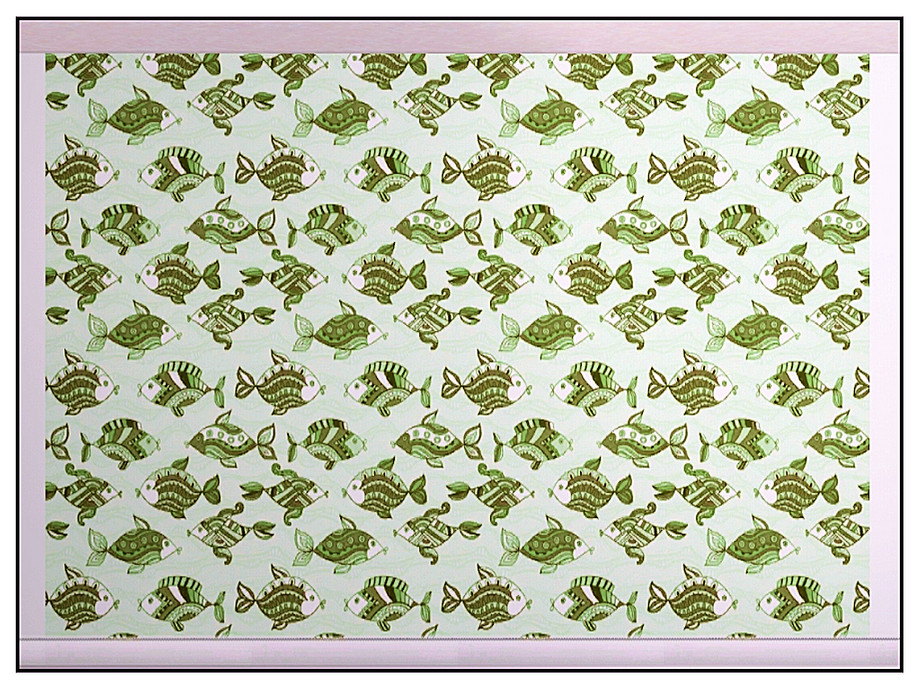 Themed pattern: Stylised fish with pouty lips in green and brown.