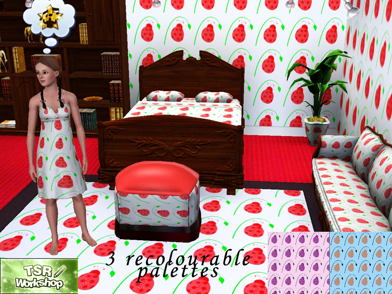 A simple yet playful pattern made from ladybugs and leaves, with 3 recolourable channels (inckuding the background!). Medium size, found under Theme patterns.