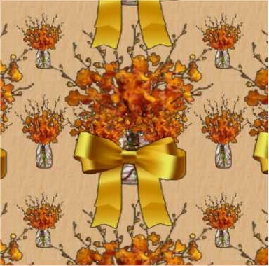 A vase of broom stems in brown shades, tied with a bright gold ribbon is the focus of this pattern.