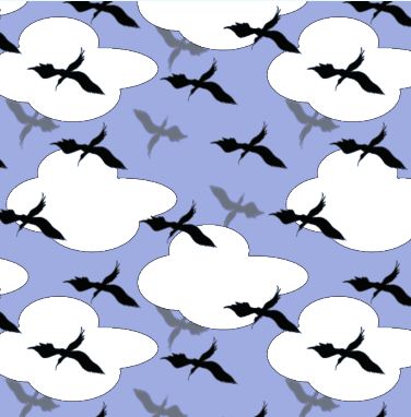 A novelty pattern of birds soaring in a cloud dotted blue sky