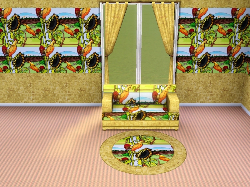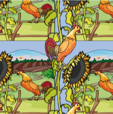 A very bold and bright novely design, this pattern features a crowing cock against a rural scene and a huge sunflower.