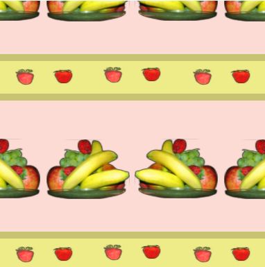 Suitable for kitchen, breakfast nook, morning room decoration, this pattern features a fruit bowl, strawberries and a toning, horizontal stripe