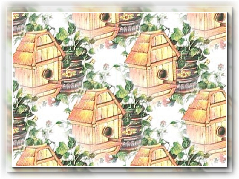 A small wooden birdhouse nestled next to a bucket of trailing ivy, is the feature of this repeat pattern.