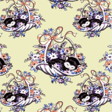 A sweet little novelty design featuring a little black and white kitten, sound asleep in a ribbon-tied, basket of flowers.