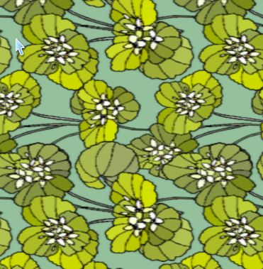 An allover, repeat design featuring clumps of white flowers and frilly, multicoloured green leaves on a deeper green ground.