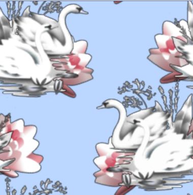 A sweet novelty pattern based around a pair of white swans, pink waterlilies and blue water.