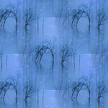 A winter scene, pictorial pattern of bare trees, rising floodwaters and steady rain.