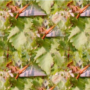 This pattern originated in a photograph of a vineyard, showing grape vines, leaves and supports.