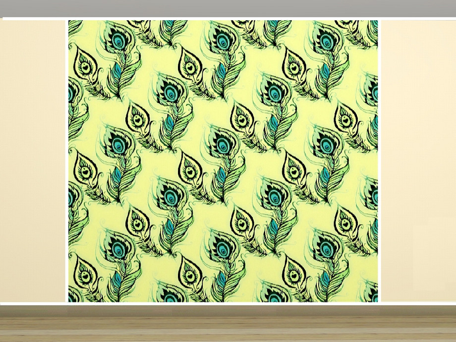 Themed pattern: peacock feathers in two sizes, blue and green on yellow