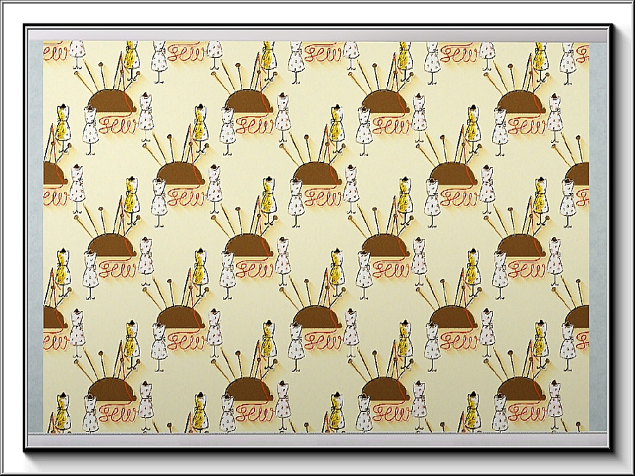 Themed pattern: elements for the sewingroom, including pins, pincushion, dressmakers model.