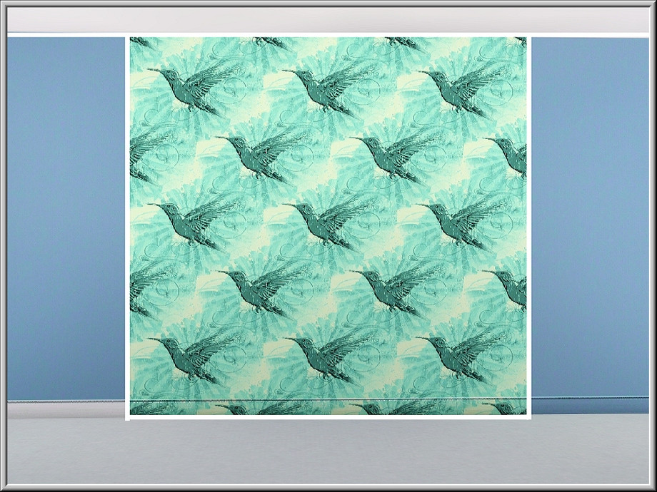 Themed pattern: blue hummingbirds against sun rays