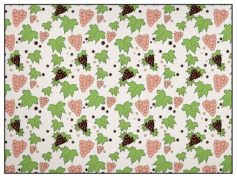 Themed pattern : red and black grapes in bunches, green leaves and single fruits o white