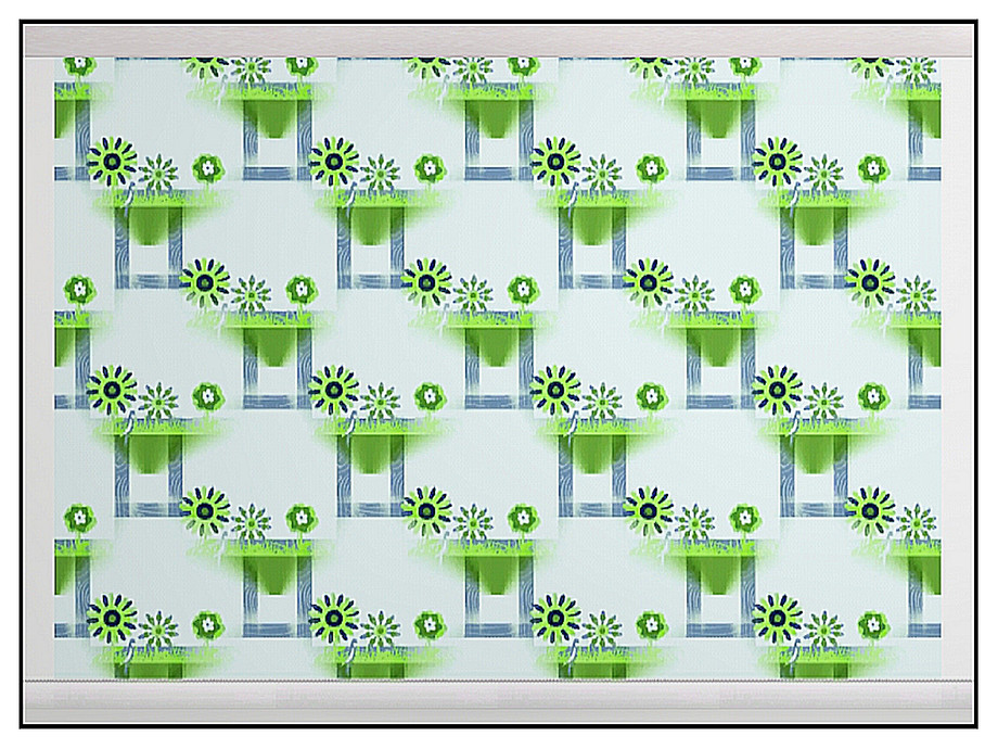 Themed pattern: stylised window boxes in blues and greens