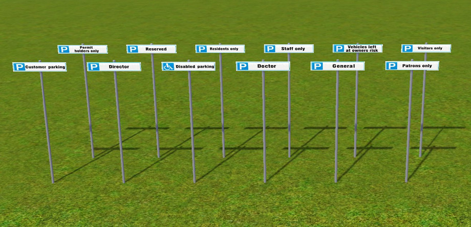 Sign post found under Decor / Misc. Decor, costs 0. This forms part of the 12 parking signs. Use the cheat "moveobjects on" to place the parking sign onto the post.