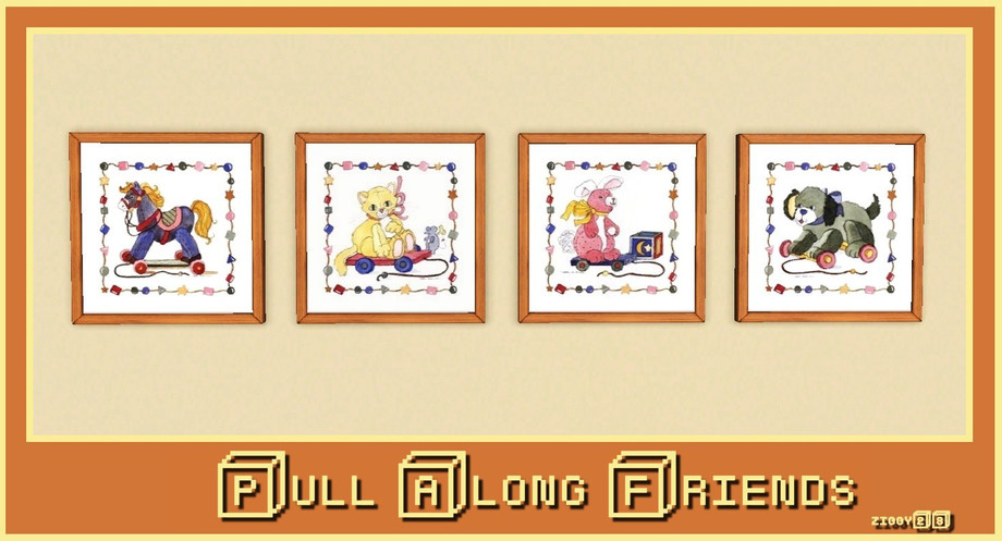 A set of four pull along friendy toys by the artist Carol Robinson. Cloned from the Maxis 'PaintingLips2x1'. Suitable for the nursery or childs room. One file four paintings.