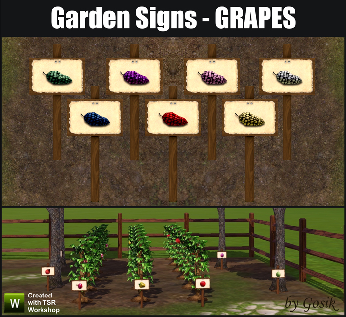 Garden Signs - Grapes by Gosik at The Sims Resource. Includes seven variations: avornalino grapes, cherimola blan grapes, cranerlet nuala grapes, gralladina fran grapes, meloire grapes, renoit grapes and regular grapes.