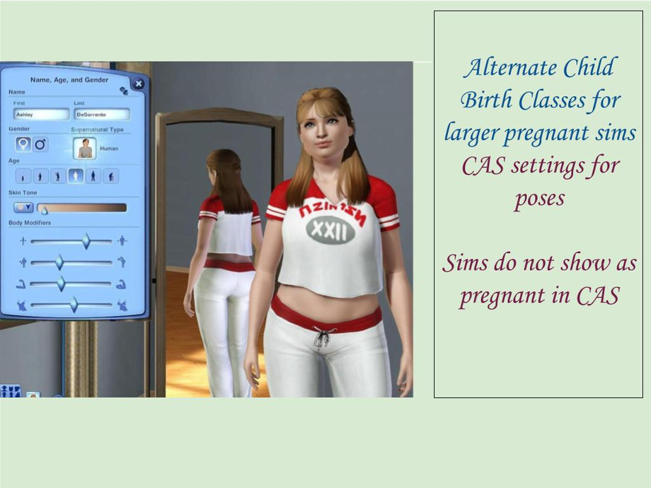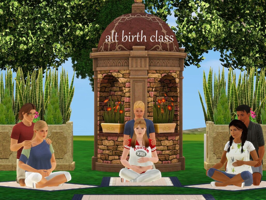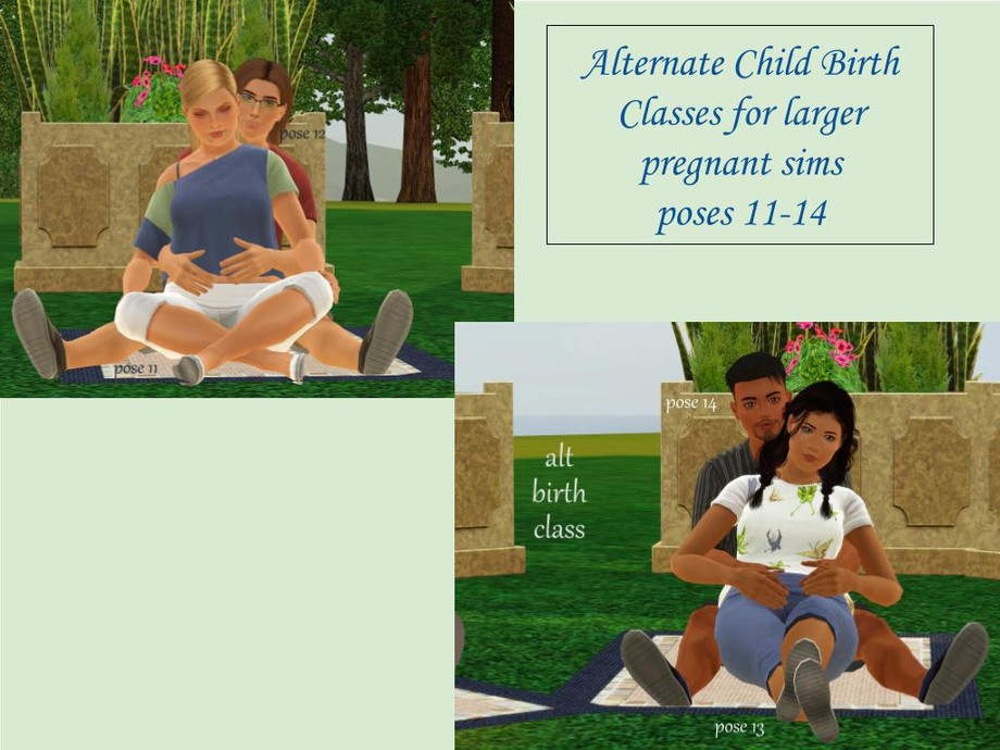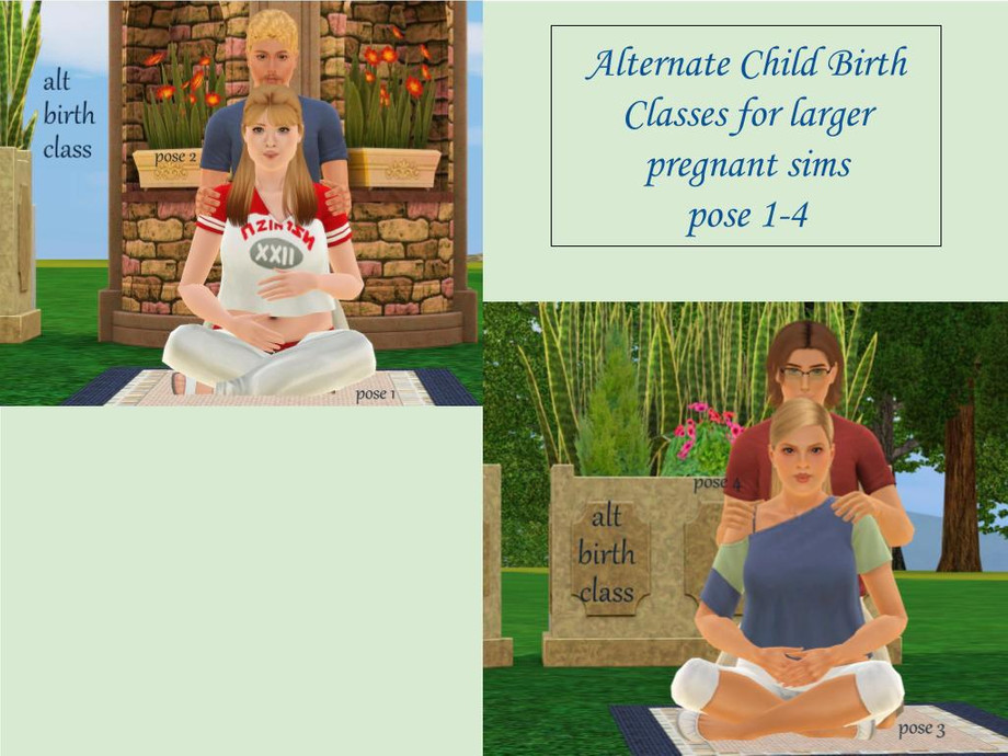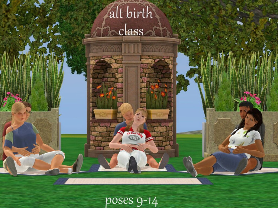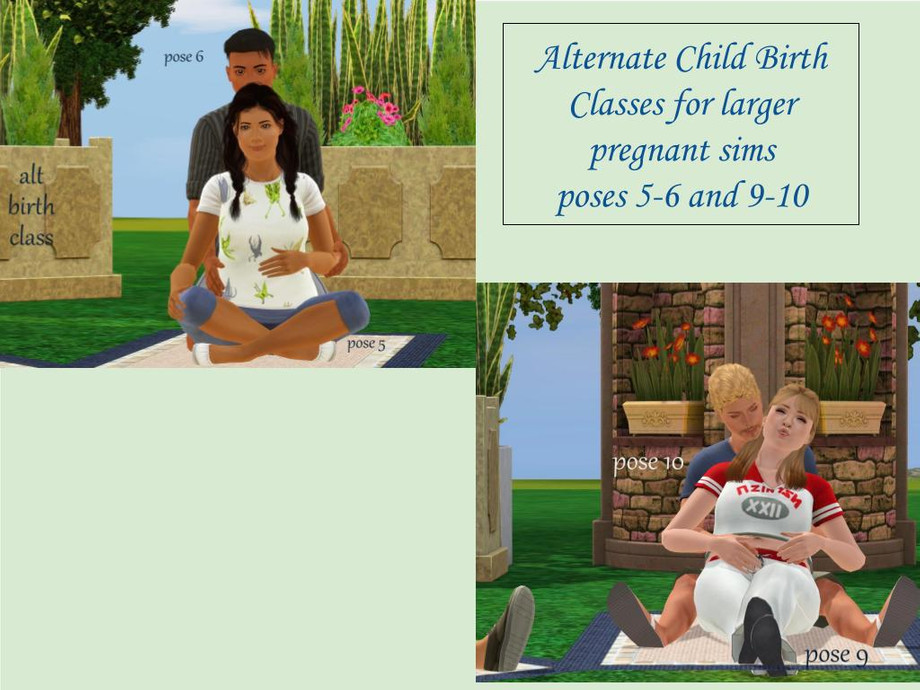 I've taken the original Child Birth Class pose set and created an alternate set for larger pregnant sims. I have not included the teacher in this set, which can be found in the original set as pose 7, 8 and 15. Poses 1-6 are listening to the teacher. Poses 9-14 are practicing breathing and relaxing.