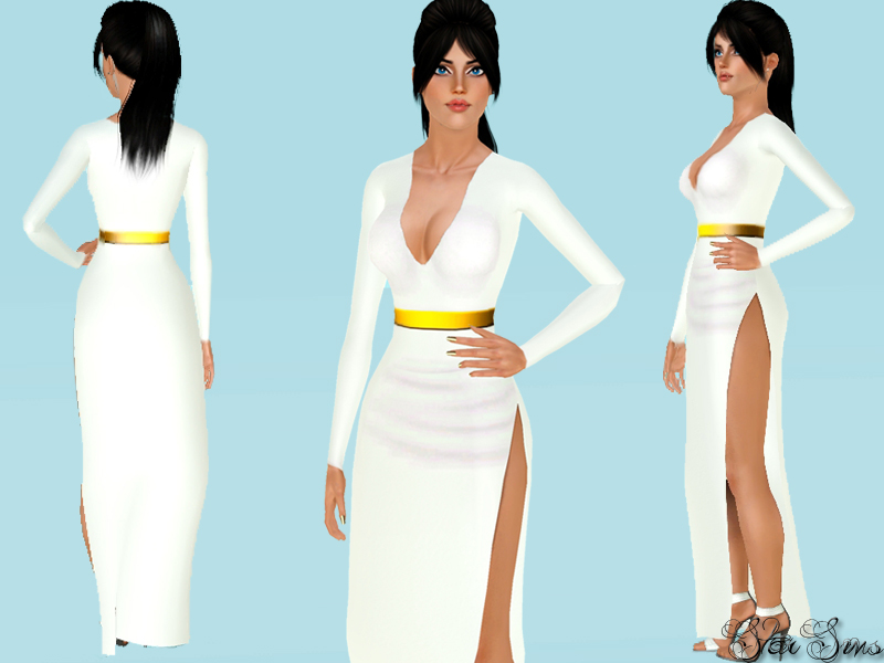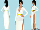 The set include a split dress, with metal belt and low neckline. An outfit with crop top and long split skirt, button detail. Perfect for stylish sims.