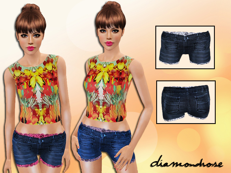 A cute summer themed clothing set for your young-adult and adult female sims. Botanics Printed Sleeveless Shirt is not recolourable, located in Everyday, Formal and Athletics wear in CAS. Lace Trimmed Denim Shorts has 2 recolourable channels, located in Everyday, swim and athletics wear in CAS. Hope you like it =)