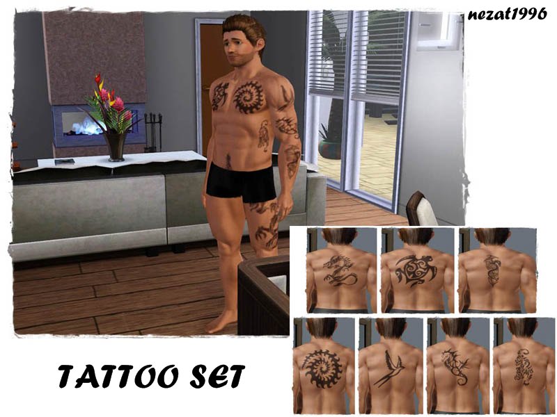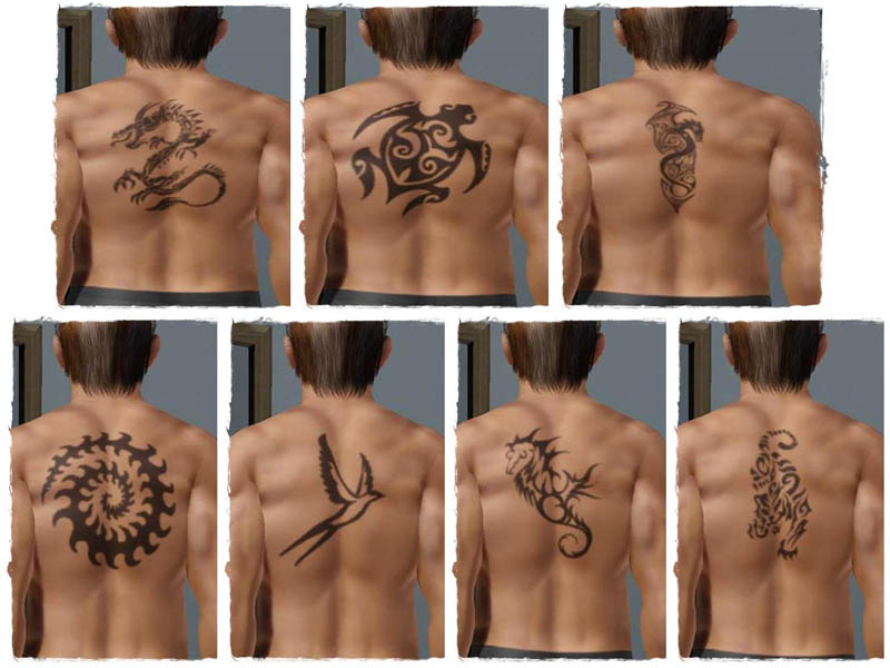 Tattoos for your simmies, bird tattoo, 2 dragon tattoos, tiger tattoo, circle tattoo, turtle tattoo and sea horse tattoo. This tattoos have only one color.