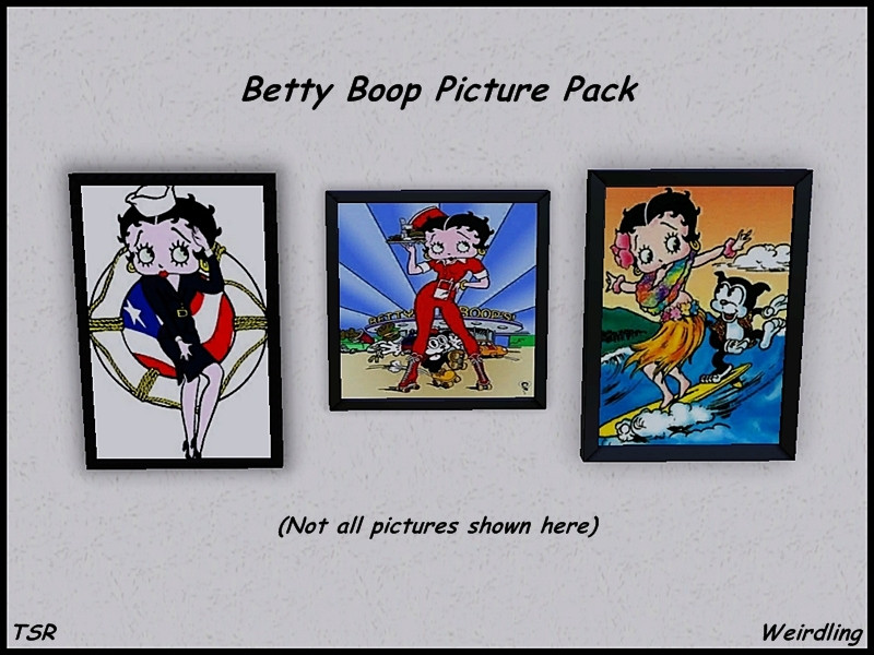 While building a house that was based off of my own house plans, I realized that I had no Betty Boop pictures to hang in the kitchen. That simply would not do... my kitchen is covered with Betty Boop memorabilia.So I rather quickly put together a pack of pictures that would work for what I was working on, and thought that it would be nice to share. (I cannot be the only Betty fan out there.) All are clones of various EA pictures and should not replace anything within your game. Betty Boop 1: Heinrich Stubbman and the Gypsies recolor. Betty Boop 2: Two Lips recolor. Betty Boop 3: Insouciance No. 12. Enjoy!