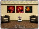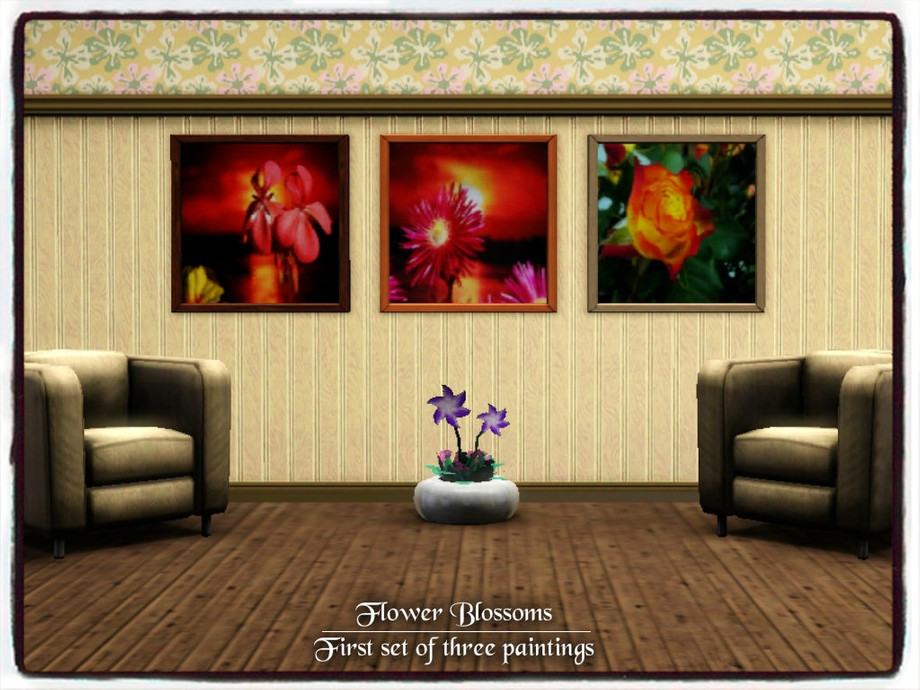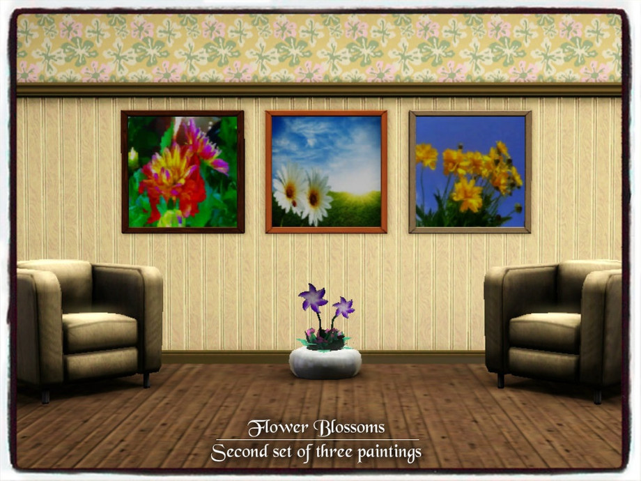 This set consists of two different files; the top row of paintings is the first Flower Blossoms Set, and the bottom row of paintings is the second set. The first set is called 'FLOWER BLOSSOM PAINTINGS' in game, and the second is 'FLOWER BLOSSOM PAINTINGS_TWO'. They can both be found under 'DECOR/WALL DECORATIONS'. The borders are recolorable.