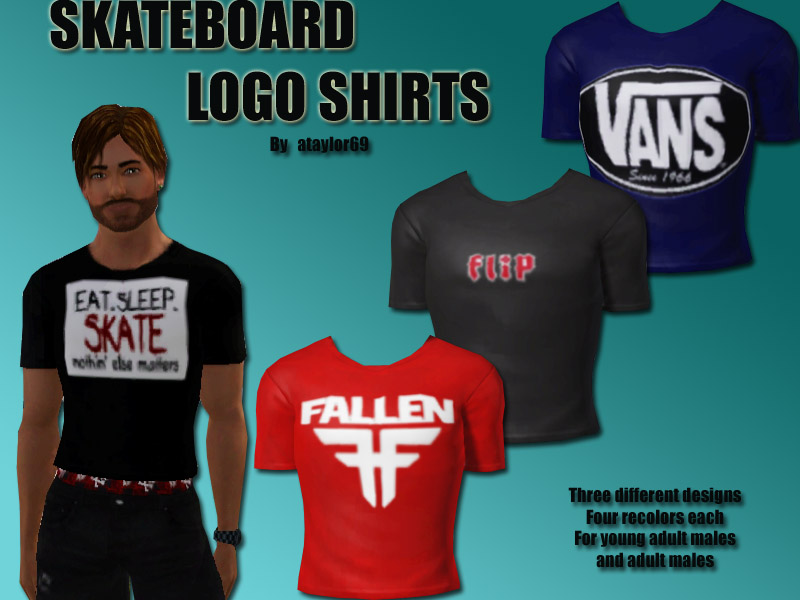 Four different skateboard logo tees with four recolors for each. These will fit young adult male and adult male. The logos are: