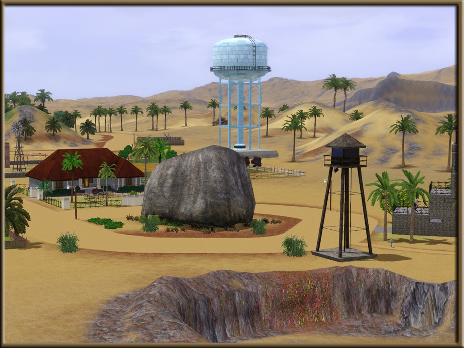 This small world has been made in the center of a large flat map. As it is meant as a really sandy world without coast line, I made the outer part of the map without possibilities for the sims and the cameras to go there.