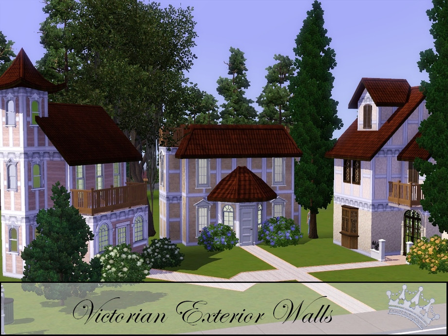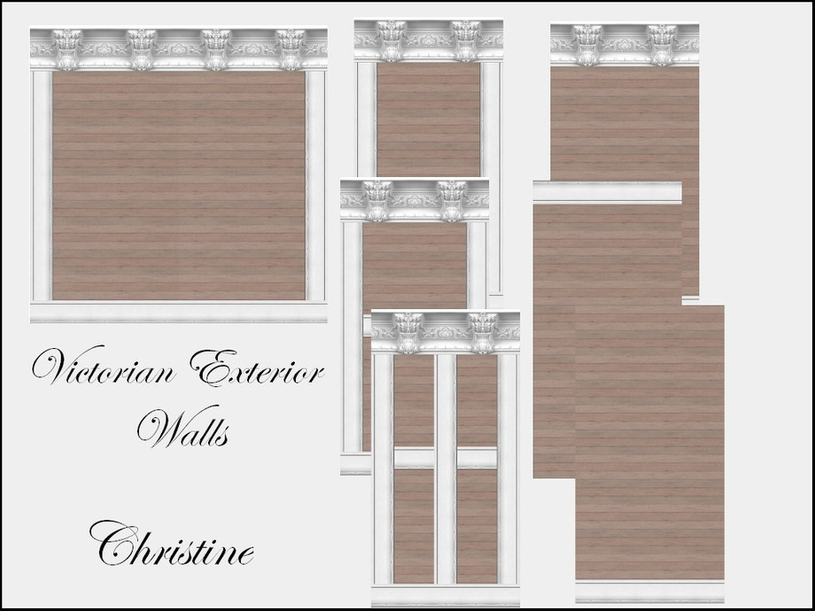 The siding in game has always been kind of um boring to me, I prefer mine to be a bit more ornate for my Victorian Homes. This is a huge set of exterior walls, you will find these walls under siding, but you can use anything you fancy with them, siding, masonry, paint etc. As always, I hope you and your Sims enjoy! Happy Simming, Christine