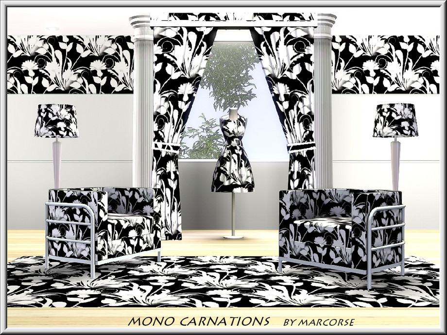 Four patterns in shades of black, grey and white. Light and Dark and Mono Carnations are found in Fabrics. Fans and Floral Geometry are in Abstract.