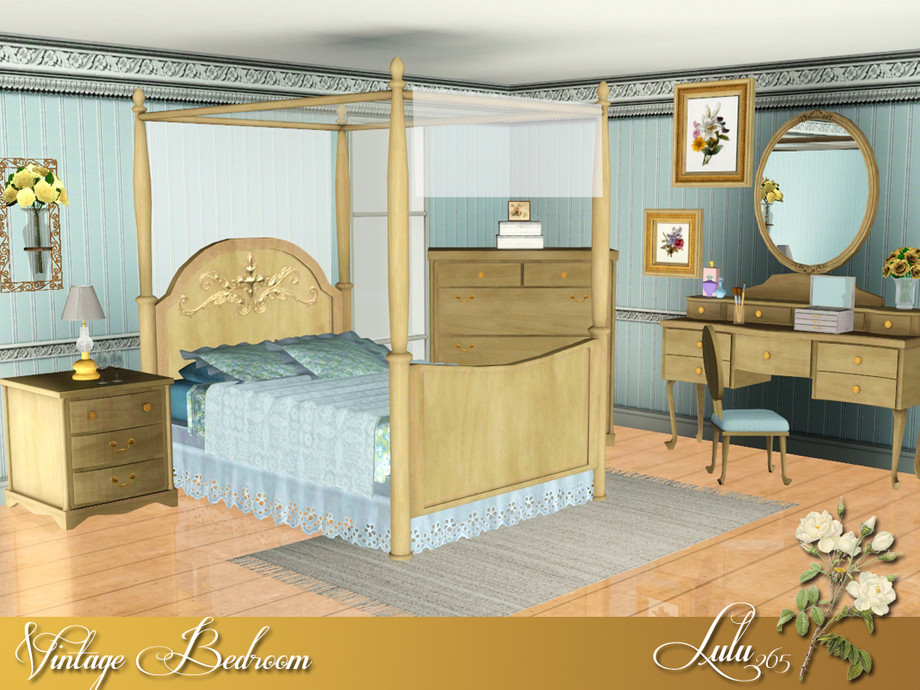 A lovely Wooden bedroom in a vintage style . 2 wood variations included. Sweet little decor bits include a jewelry box , make up brushes , lace bed pillows and comforter , also included are a gold and glass lamp, decor boxes , a vase of roses and a flower wall vase