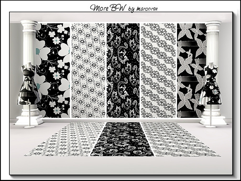 Five black and white floral designs. Gondola and BW Oblique Abstract are found in Abstract, the remainder in Fabric.