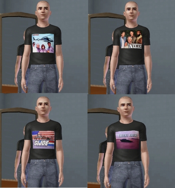 Let your sims show their retro side with this collection of T shirts immortalizing everyone's favorite tv shows from the eighties