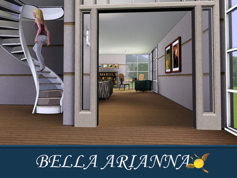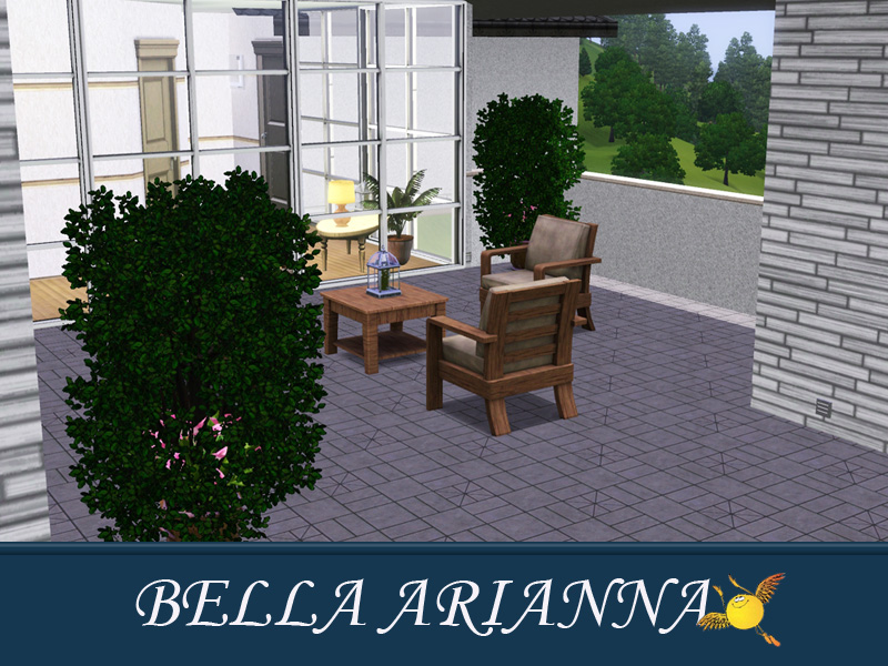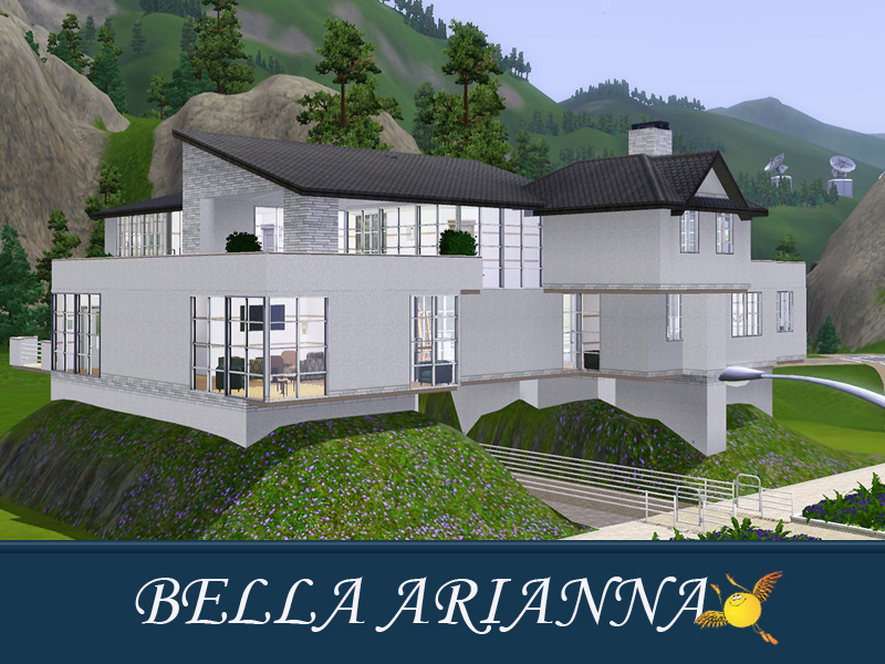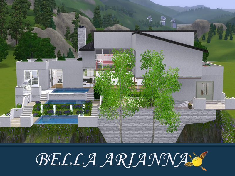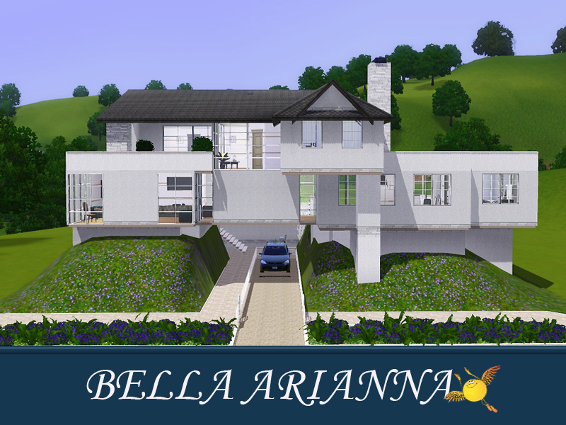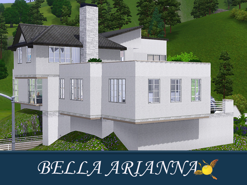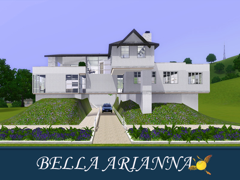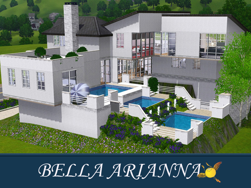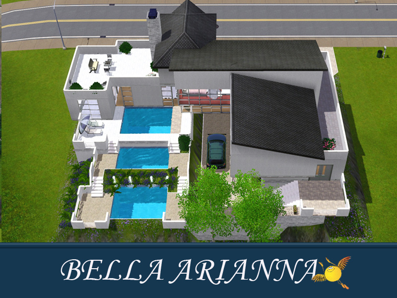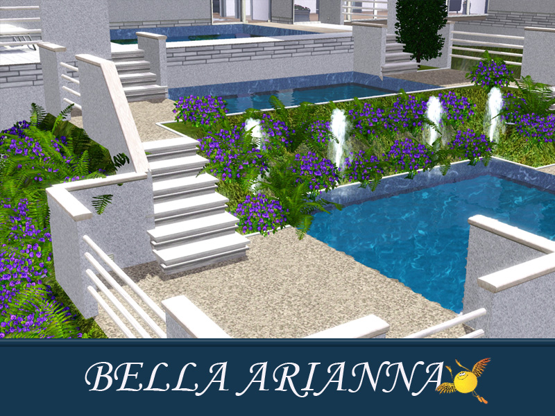 A modern white home with three bedrooms on the second floor and their bathrooms. First floor: An easy to use kitchen and a comfortable dinning and sitting room. A gorgeous pool created in three level so that your sims can get privacy from each other if they want. The purple flowers give a beautiful touch to the whiteness of this lot. You can also get a garage area at the entrance and big balconies for the summer days.