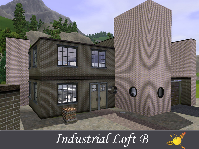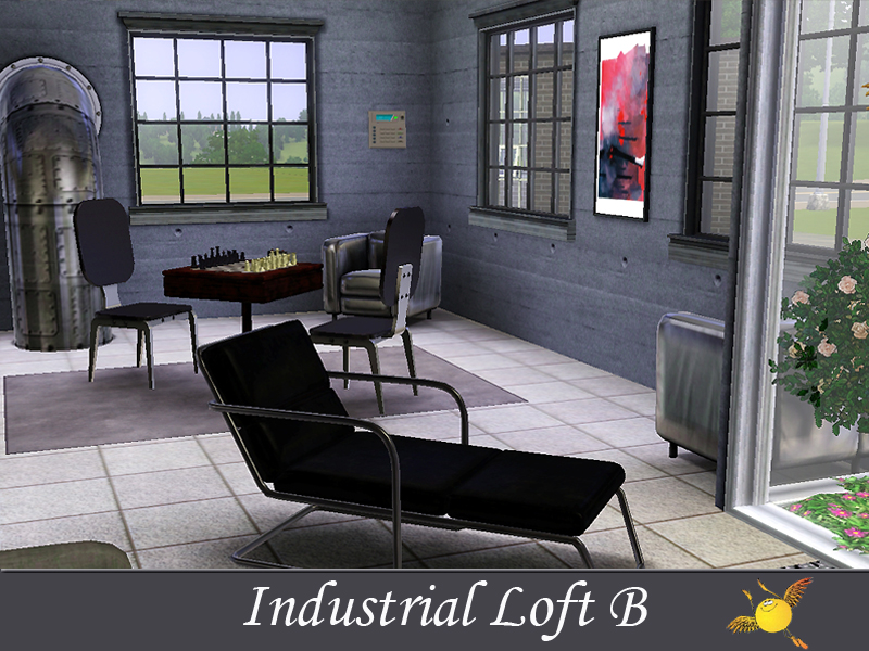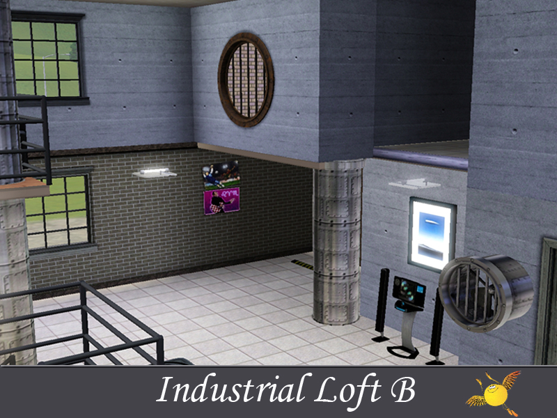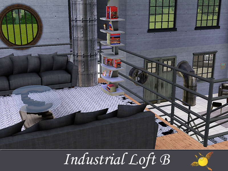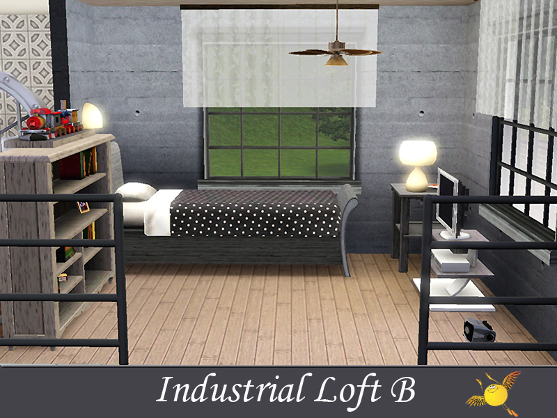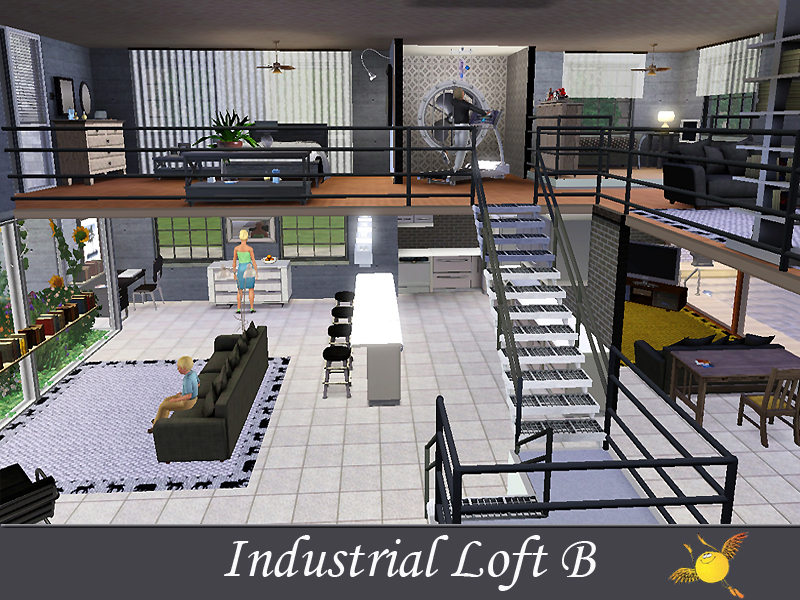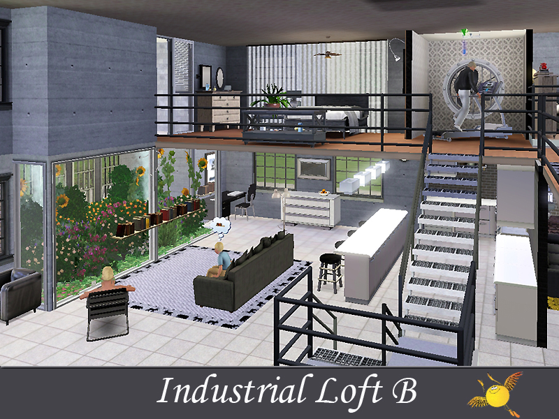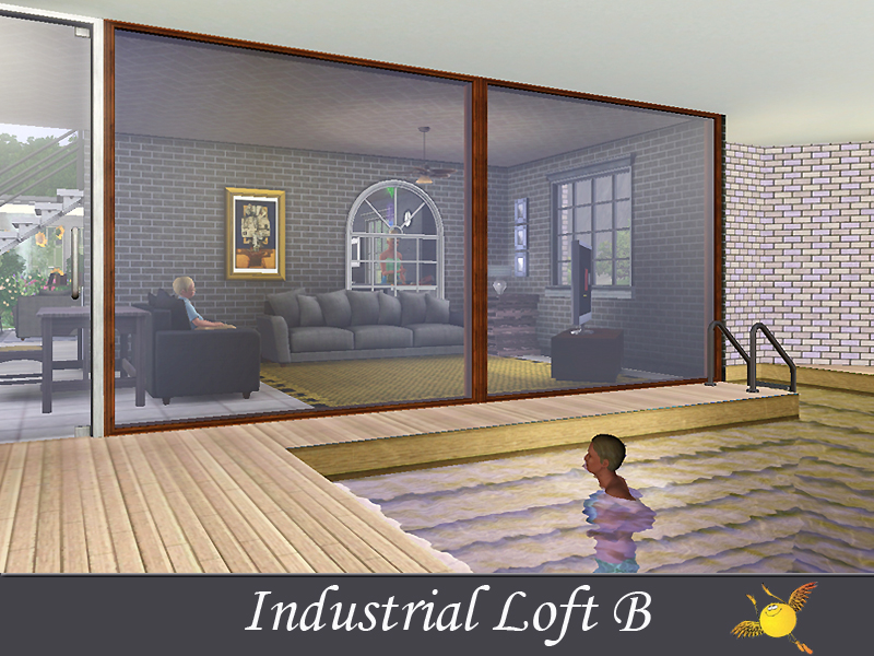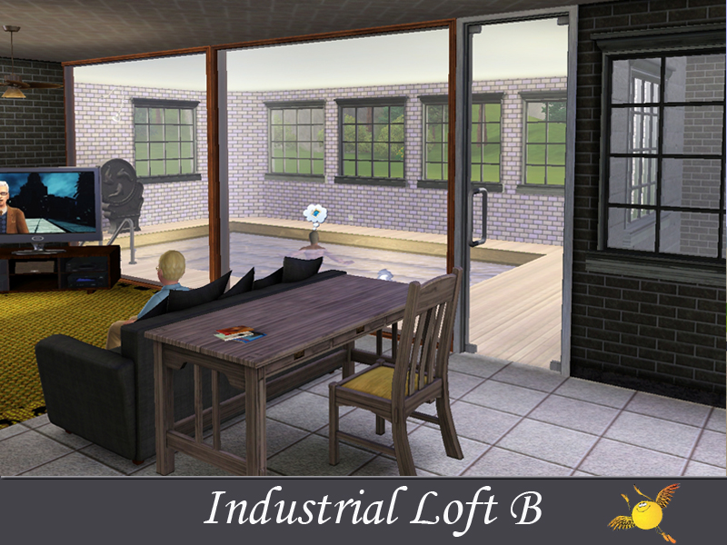 A two bedroom and two storey industrial loft which has all the comforts one needs to live in style. Base area: kitchen, dinning/sitting space, tv/reading space, a tiny indoor garden and a pool. The two bedrooms on the second floor are designed to keep the privacy that your sims need to get some rest
