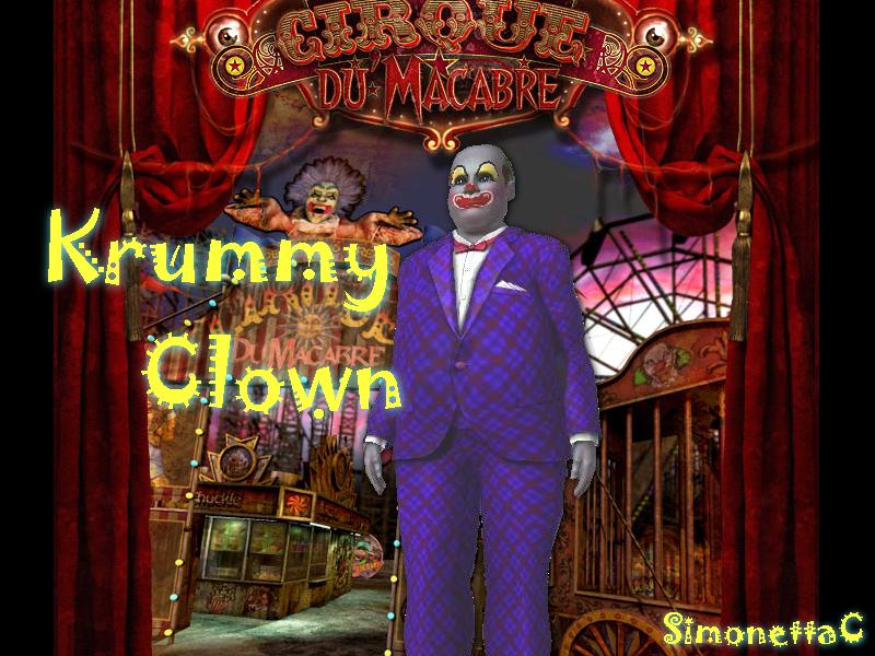 Krummy is a very bad clown. He does not like children at all. He has no sense of humour and is quite crazy really. He loves to spray kids with water, from the joke flower that he has pinned to his lapel. He enjoys blowing up balloons, only so he can burst them. Not the kind of clown you would want at your childs party :(