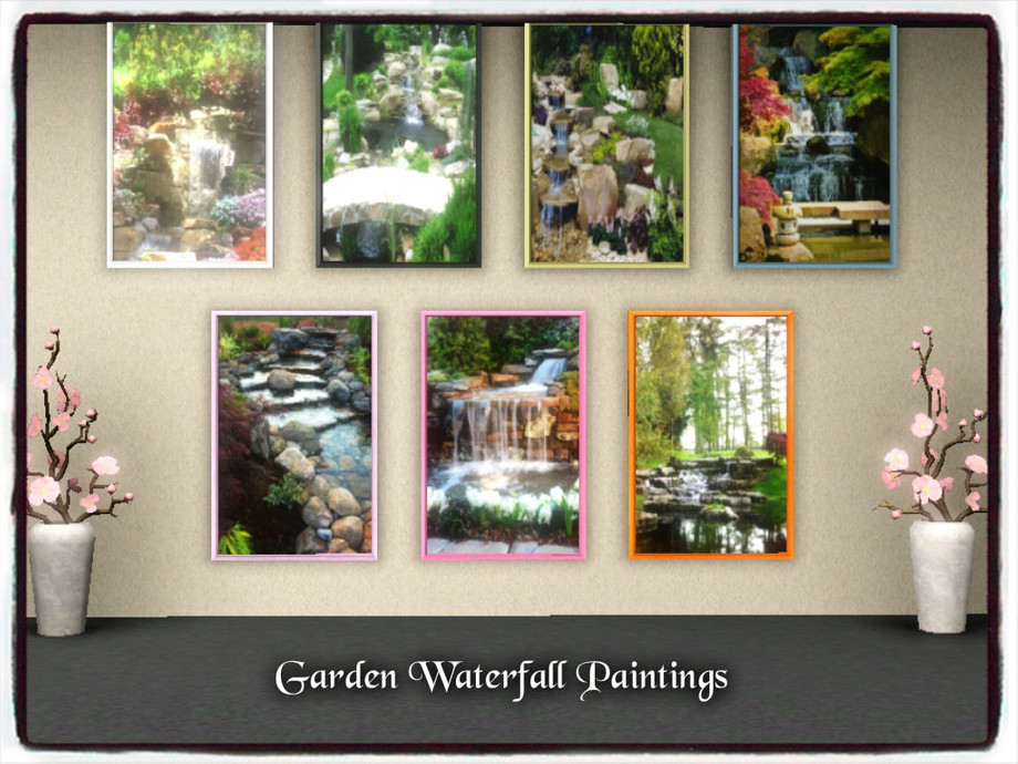 Garden Waterfall paintings for your Sims home... this is one single file of waterfall paintings, and is called 'GARDEN WATERFALL PAINTINGS' in game. It has seven paintings. It can be found under 'DECOR/WALL DECORATIONS'. The borders are recolorable.