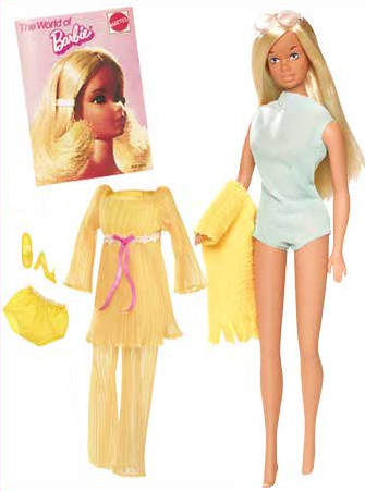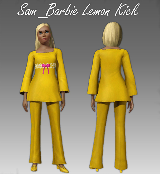 New Mesh. Based on the vintage 1970 fashion Lemon Kick for Barbie doll by Mattel. This long sleeved top and palazzo pants ensemble is fashioned from lemon mini-pleated nylon. The empire waist is defined by a white floral braid and contrasting hot pink bow. 4 recolorable palettes.