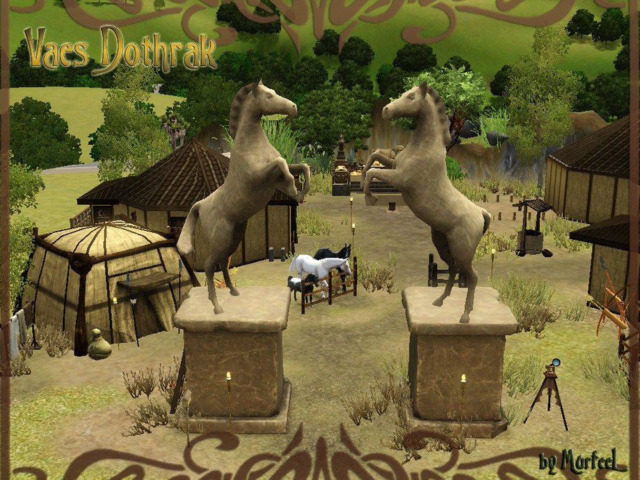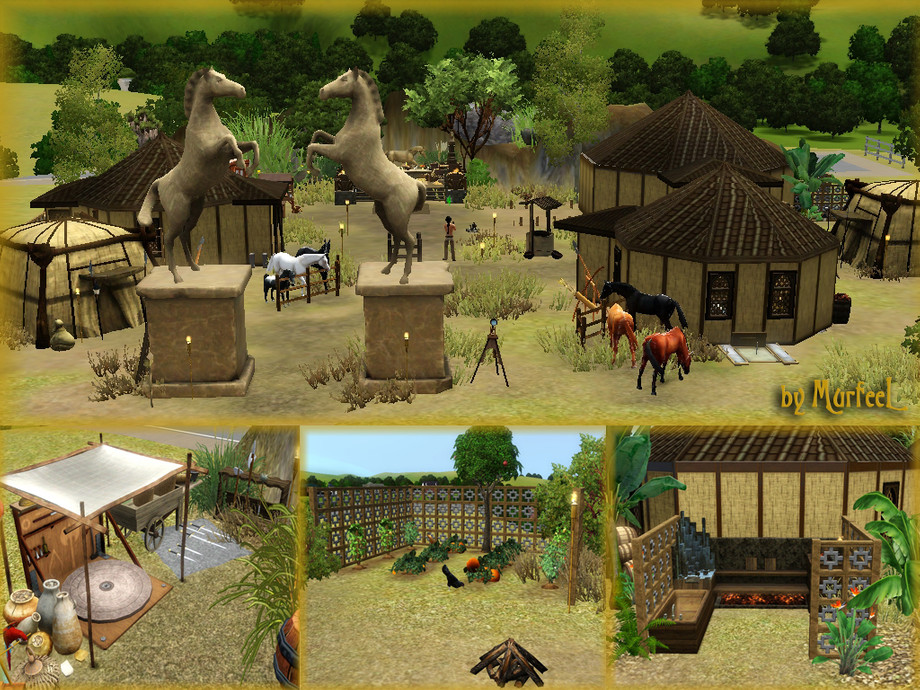 The only permanent city of nomads who love living the rugged life out on the grasslands, amidst the roaming herds of wild horses and dry steppes and scorching heat and ferocious biting insects and poisonous snakes and salty water and--! Okay, you get it. XD Inspired by footage from the Game of Thrones HBO series of the Dothraki city Vaes Dothrak, and wherever the heck else they camped out, including one hut (Drogo's), 2 baths, one main hall hut (doubling as a kitchenette and bar with a bull riding machine to test Dothraki prowess--grrr), and a marketplace and garden section. Enjoy!